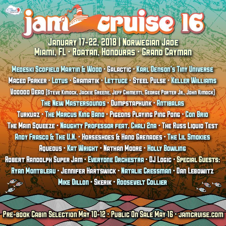 The 16th edition of Jam Cruise will feature performances by Medeski, Scofield, Martin & Wood, Galactic, Karl Denson’s Tiny Universe, Maceo Parker, Lotus, Lettuce and more when it sets sail from January 17-22, 2018.