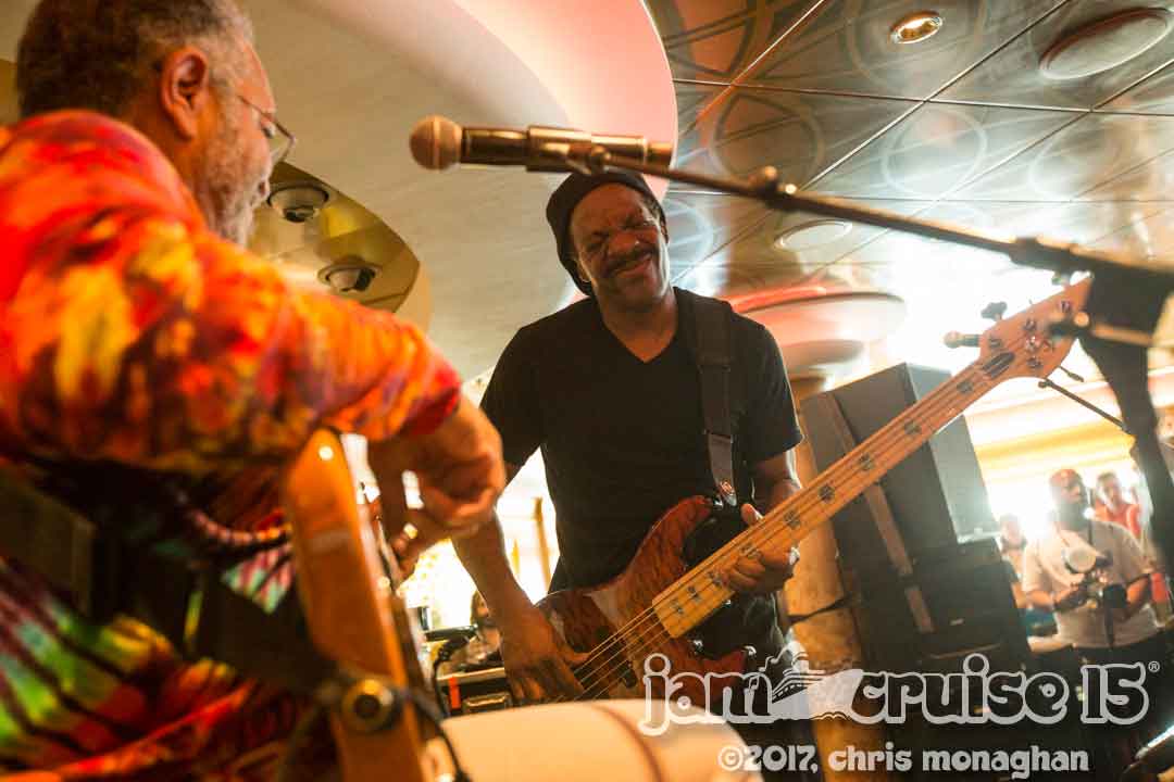 As far as New Orleans music was concerned, it was a relatively light day, with only a couple of Crescent City acts appearing on one of the boats many stages. However, there was still plenty to go around, including a nearly afternoon bass battle that found George Porter Jr. and Tony Hall trading licks in the surprisingly classy Bar City section of the ship.