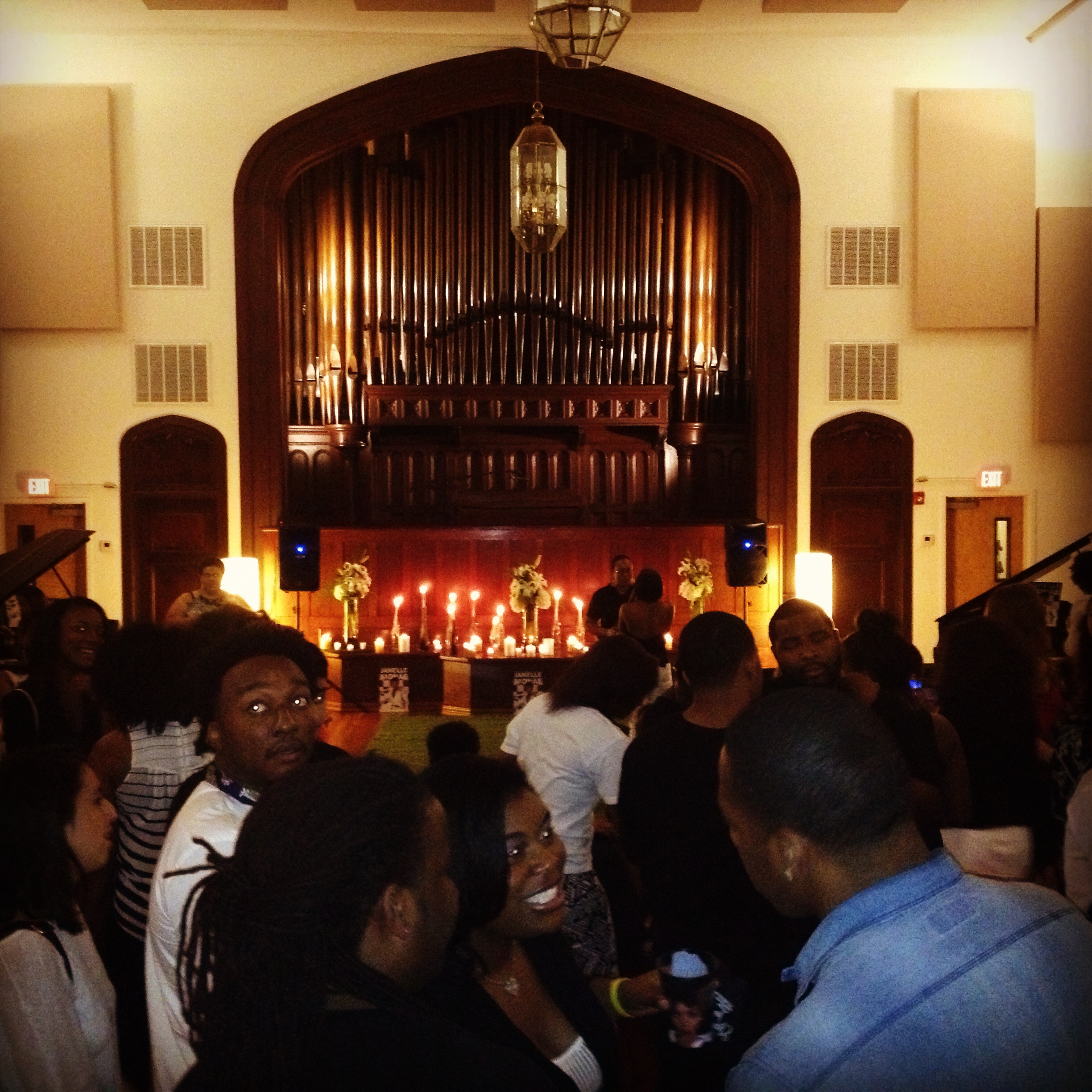 Upon check-in, guests were given a pair of footie socks – one black, one white – and asked to remove their shoes at the door. Soon the former church, candles blazing at the former altar, took on a sock-hop feel as guests sipped on “Electric Lady” cocktails and enjoyed passed hors d’oeuvres served in white gloves. Monae did speak briefly before getting right into the music, explaining that “The Electric Lady” was actually a series of paintings she created while performing live, a trademark of her shows. The day-glo alpha woman comes to sonic life in the new songs, which Monae explained relate how she feels about society, sexuality and more.