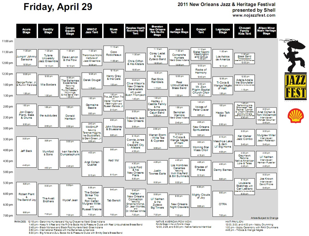 Jazz Fest 2011 “Cube” Schedule: Friday, April 29 March 30, 2011 by: OffBeat Staff Leave a comment Click the schedule to view full-size, or right click to save or print. Back to all days Jazz Fest’s Interactive Cubes Jazz Fest Cubes: Friday, April 29 Saturday, April 30 Sunday, May 1 Thursday, May 5 Friday, May 6 Saturday, May 7 Sunday, May 8 CubeJazz FestNew Orleans Jazz & Heritage FestivalNewsSchedule