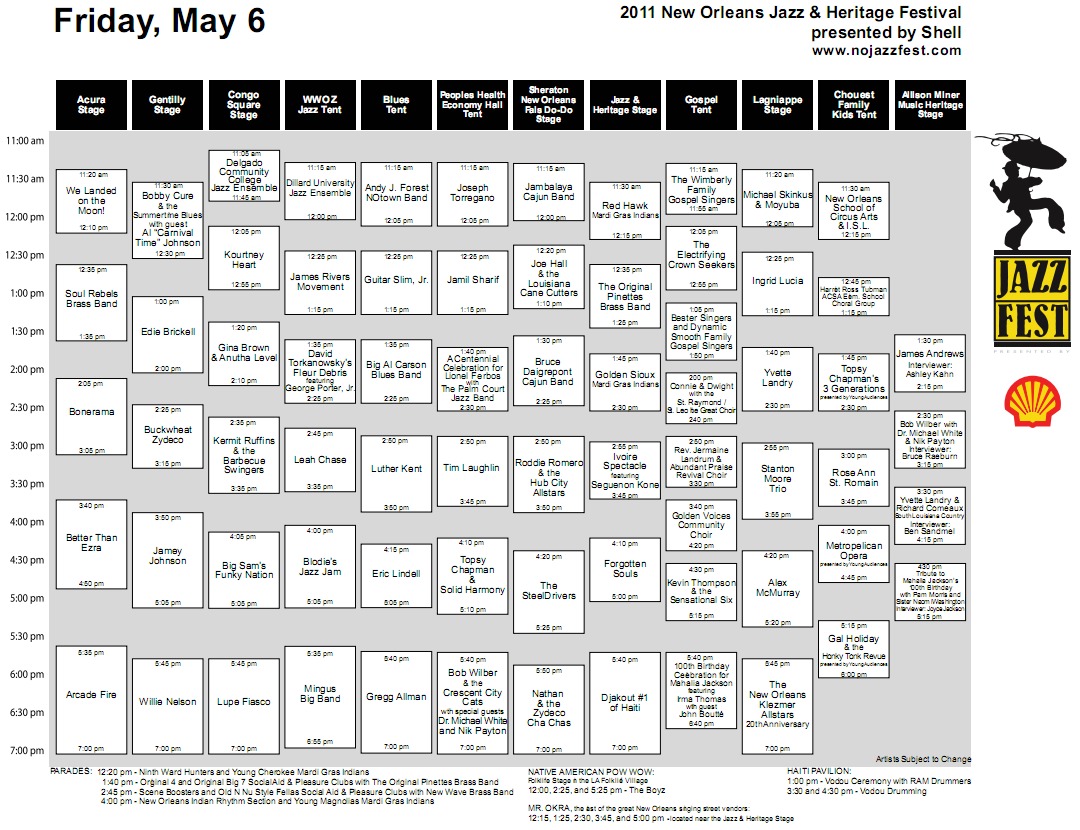 Jazz Fest 2011 “Cube” Schedule: Friday, May 6 March 30, 2011 by: OffBeat Staff Leave a comment Click the schedule to view full-size, or right click to save or print. Back to all days Jazz Fest’s Interactive Cubes Jazz Fest Cubes: Friday, April 29 Saturday, April 30 Sunday, May 1 Thursday, May 5 Friday, May 6 Saturday, May 7 Sunday, May 8 CubeJazz FestNew Orleans Jazz & Heritage FestivalNewsSchedule