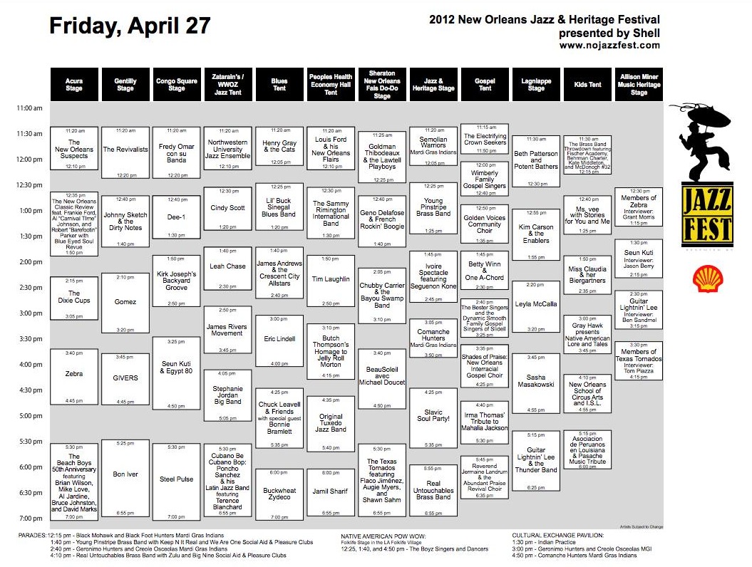 Jazz Fest 2012 “Cube” Schedule: Friday, April 27 at the New Orleans Jazz & Heritage Festival March 27, 2012 by: OffBeat Staff Leave a comment Click the schedule to view full-size, then right/control click to save or print. Back to all days Jazz Fest’s Interactive Cubes Jazz Fest Cubes: Friday, April 27 Saturday, April 28 Sunday, April 29 Thursday, May 3 Friday, May 4 Saturday, May 5 Sunday, May 6 CubeJazz FestLineupNew Orleans Jazz & Heritage FestivalNewsSchedule