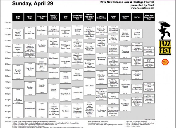 Jazz Fest 2012 “Cube” Schedule: Sunday, April 29 at the New Orleans Jazz & Heritage Festival March 27, 2012 by: OffBeat Staff Leave a comment Click the schedule to view full-size, then right/control click to save or print. Back to all days Jazz Fest’s Interactive Cubes Jazz Fest Cubes: Friday, April 27 Saturday, April 28 Sunday, April 29 Thursday, May 3 Friday, May 4 Saturday, May 5 Sunday, May 6 CubeJazz FestLineupNew Orleans Jazz & Heritage FestivalNewsSchedule