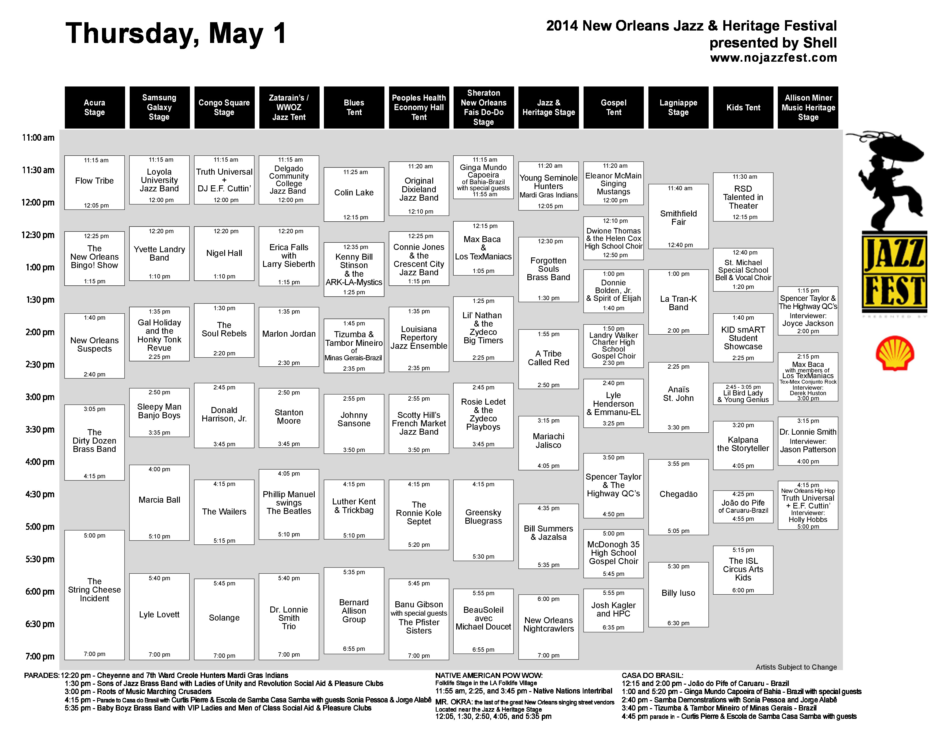 Jazz Fest 2014 “Cube” Schedule: Thursday, May 1 at the New Orleans Jazz & Heritage Festival March 25, 2014 by: Stephen Maloney Leave a comment Click the schedule to view full-size, then right/control click to save or print. Back to all days Friday, April 25 Saturday, April 26 Sunday, April 27 Thursday, May 1 Friday, May 2 Saturday, May 3 Sunday, May 4 2014CubeJazz FestLineupNew Orleans Jazz & Heritage FestivalNewsSchedule