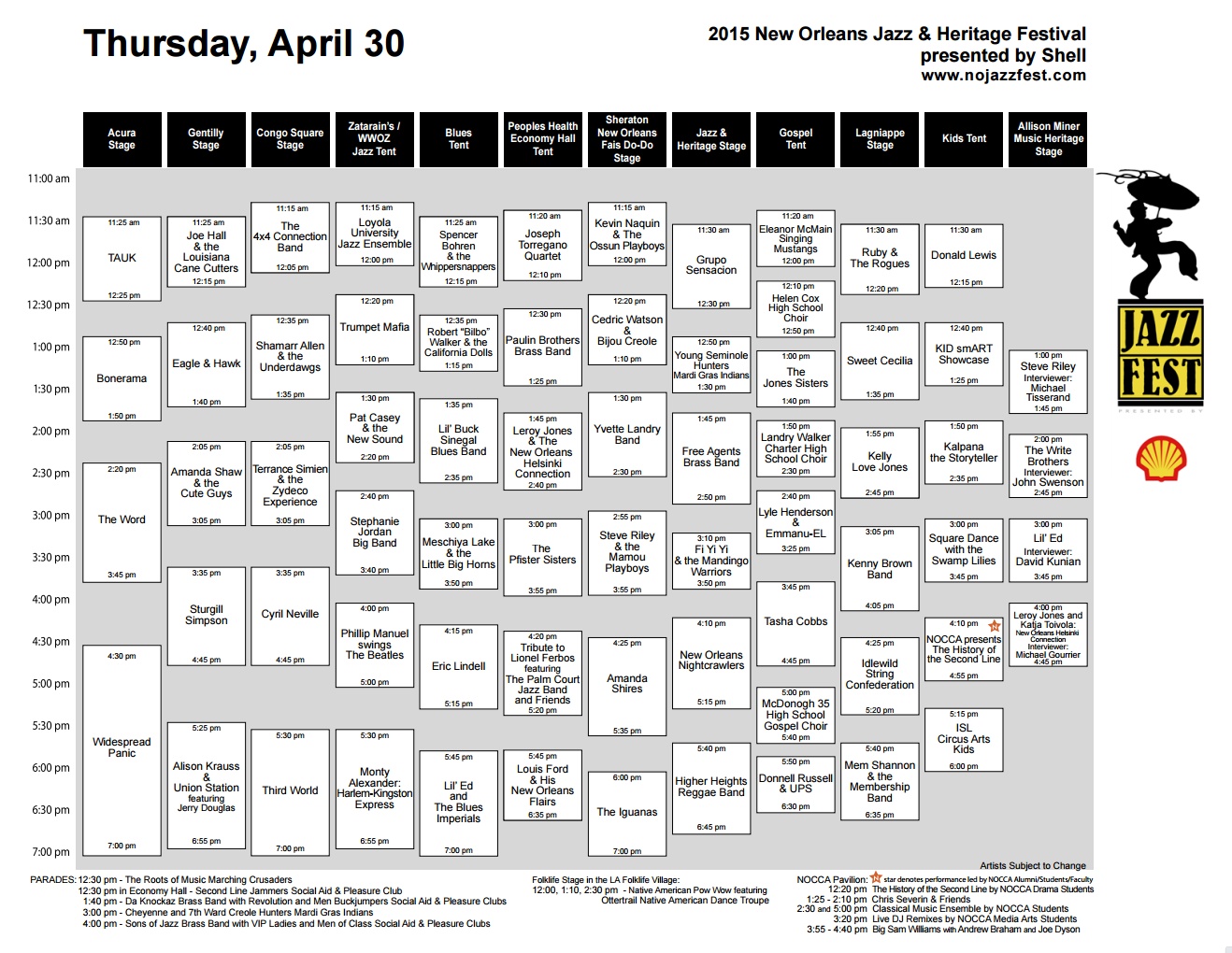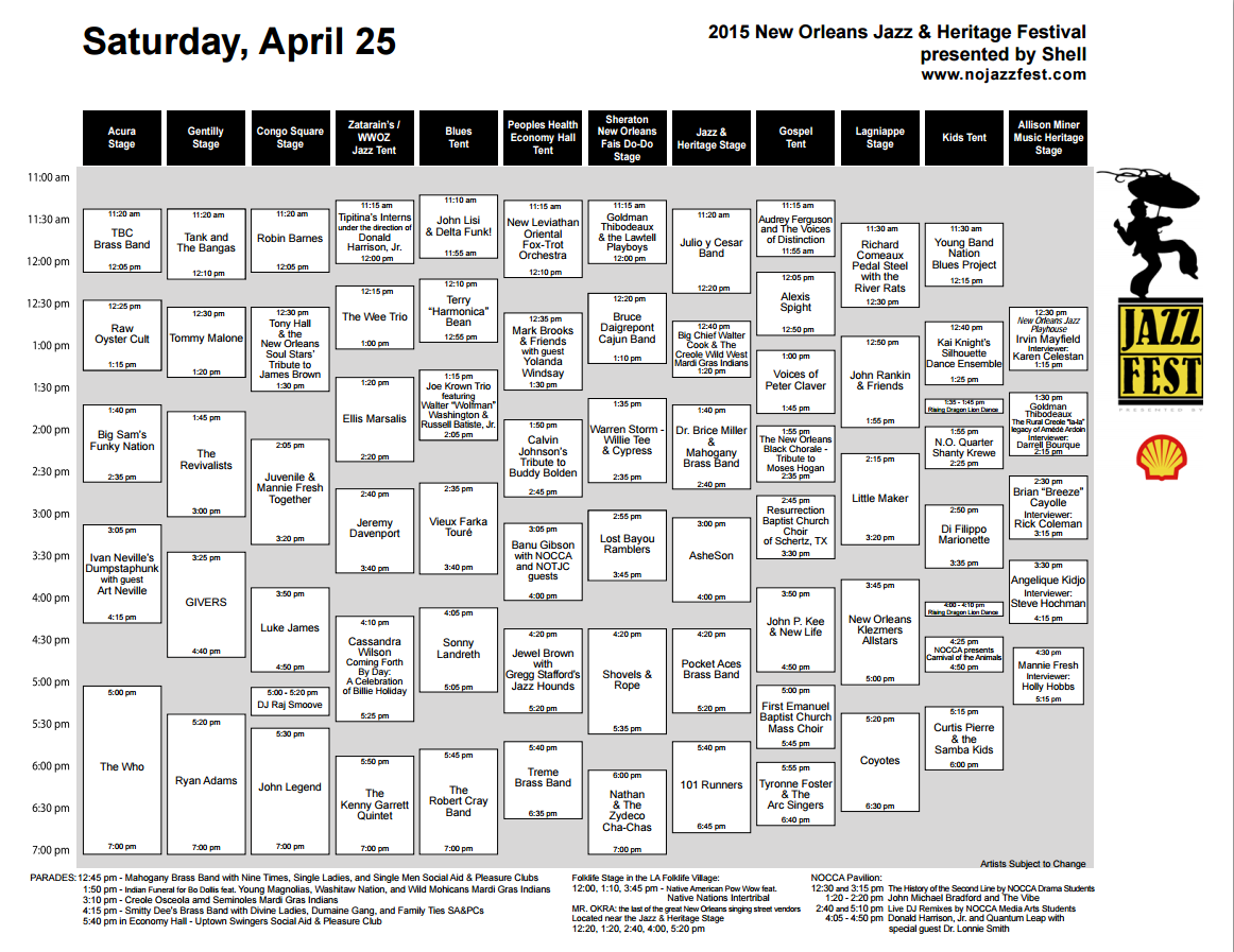 The full daily schedule, released annually 30 days before the first day of Jazz Fest, serve as a guide for the hundreds of thousands of music fans that flock to the Fair Grounds each year.
