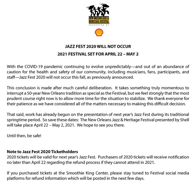 In a statement posted to Twitter, Jazz Fest said “Jazz Fest 2020 will not occur this Fall, as previously announced.” In the statement, organizers said “It takes something truly momentous to interrupt a 50-year New Orleans tradition as special as the Festival, but we feel strongly that the most prudent course right now is to allow more time for the situation to stabilize.” See the full statement below: