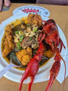 May Day is known for marking the beginning of summer, so, of course, Zena Moses was right on time performing “Feels Like Summer” by Childish Gambino at the Congo Square Stage. Her top band, including trombonist Jeremy Phipps, also helped set the tone for the spirit of Jazz Fest and New Orleans throughout their set. Meanwhile, I had a treat to eat. This year, Clesi’s upped their game with the Crazy Clesi, adding fried alligator to crawfish rice and etouffee.