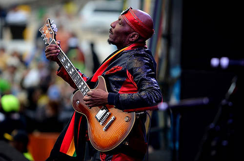 Three years ago a one-stringed guitarist, Robert “One String” Gibson, caused a small sensation at Jazz Fest and this year the Ocho Rios, Jamaican artist Brushy One String seemed likely to do the same. The stripped-down guitar is an obvious attention-getting device, Brushy uses the low E string to play walking basslines and the guitar’s lower body as a hand drum. His material alternated between patois-heavy dancehall reggae and old-school Rasta spirituality, all of it was strong and his voice stood up to the minimal accompaniment. It remains to be seen if Brushy will come up with a set’s worth of good material—His Destiny album has just seven songs and on Friday he did similar half-hour sets at the Blues Tent and the Jazz & Heritage stage—so Quint Davis’ intro of him as an “international phenomenon” may have been be a tad premature. Wait and see, but his US debut was promising.