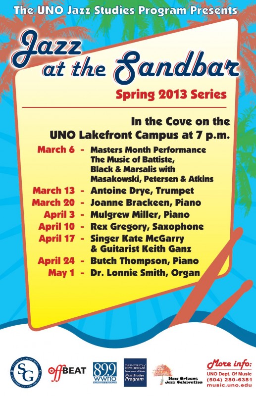 New Orleans Jazz Celebration and the University of New Orleans Jazz Studies program proudly announce the return of the favorite $5 live concert series, “Jazz at The Sandbar,” where each week a new jazz instrument is highlighted and explored through performances from some of the most renowned jazz musicians that command these magic sound tools.