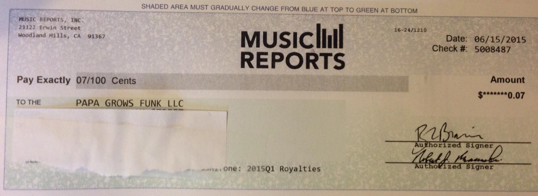 Not too long after, Gros took to Facebook to share an image of a Papa Grows Funk royalty check he received from Music Reports on June 15, 2015, for a whopping seven cents.
