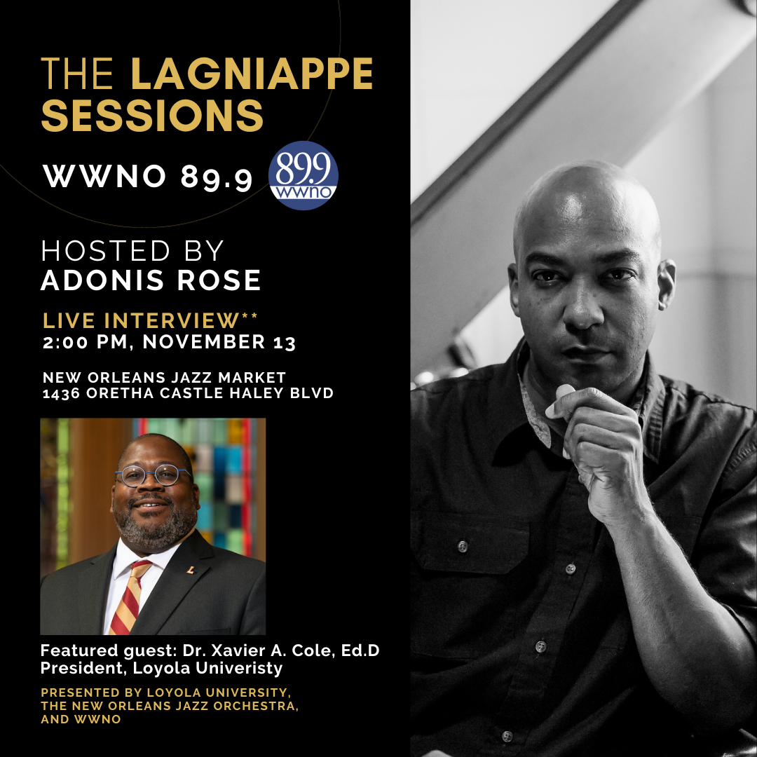 Join Adonis Rose, Grammy-Award-winning Performing Artist, Artistic Director of The New Orleans Jazz Orchestra, and host of the Lagniappe Sessions, for a special live (recorded) interview with the new President of Loyola University, Dr. Xavier A. Cole, Ed.D. on Monday, November 13, 2:00 p.m. at The New Orleans Jazz Market.