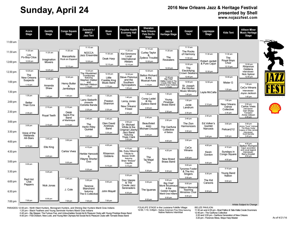 As previously reported, Jazz Fest will kick off the Fair Grounds Race Course tomorrow, April 22. You can check out our searchable schedule and late night concert guide here.