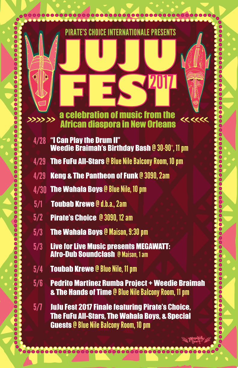 – JuJu Fest 2017 Finale – Pirate’s Choice, The FuFu All-Stars, The Wahala Boys, & Special Guests @ Blue Nile Balcony Room 10pm feat. Raja Kassis, Luke Quaranta, Sam Dickey, Alfred Jordan, Eric Vogel, Ricio Fruge, Jeronne Ansari, Michael Watson, Steven Glenn, Weedie Braimah, Daniel Meinecke, Ricio Fruge, Wes Anderson, Brad Walker