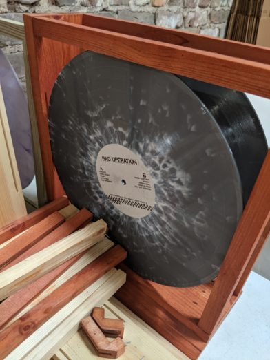The mold is made from an outside vendor who holds the master copy using electro deposition technology — literally the .wav files are imposed onto the master plate. The press forms the record in about 40 seconds. A robotic arm transfers the cast record onto a cutting station where mold flash is removed and the record shape is finalized. The record is presented to the operator for stacking and adding a label as the record cools. Flash and defective records can be recycled for use again based on customer agreements regarding raw materials. Musicians can choose colors, recycled content, artwork, sleeves and more all from the Bywater area press company.