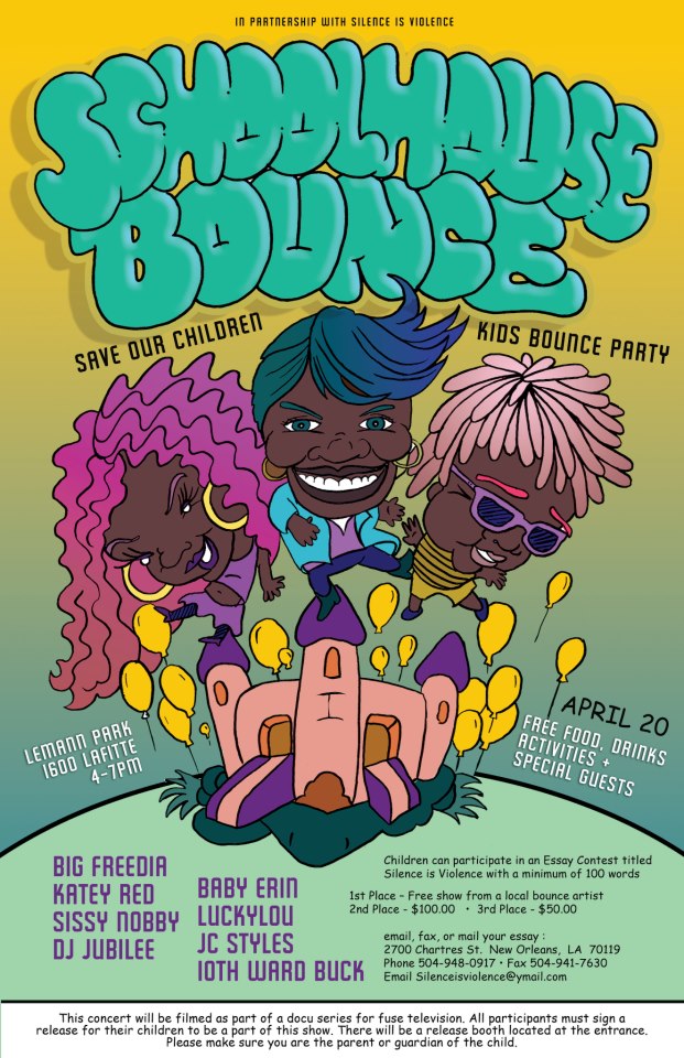 Everyone knows about “Schoolhouse Rock,” right? Rusty Lazer brainstormed this inaugural youth Bounce fest entitled, “Schoolhouse Bounce” and says that when they approached the grassroots anti-violence organization, Silence is Violence, “they jumped all over it” and hopped on board as a presenting partner immediately. Silence is Violence will run the youth essay contest and administer prizes. The goal, Katey and Rusty say, is to show youth in New Orleans that you don’t have to use guns or other forms of violence to release anger or frustration, that energetic creative outlets like writing, lyricism and Bounce dancing are healthier, safer alternatives to express yourself. Word on the street is that the star trio has recently filmed a new “Schoolhouse Bounce” music video with original, clean-cut music set to debut as well.