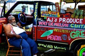 We all know Mr. Okra. One of the very last of the great New Orleans singing street vendors, he cruises our neighborhoods in his brightly-painted produce truck equipped with an old-school megaphone PA system to bring us fresh fruits and veggies every day. If you’ve lived in the Crescent City, chances are you’ve been stirred to the curb of your street at least once by Mr. Okra’s deep, gravelly voice.