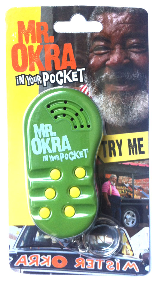 The familiar sound of “I have oranges and bananas. I have eating pears and apples” outside your window always makes your day better, and now you don’t even have to be in New Orleans to hear the friendly chant: that’s right, you can take Mr. Okra with you everywhere. Emanation, the company that’s brought you laughs for days at the push of a button with their talking keychain series “In Your Pocket,” recently released its latest edition, the Mr. Okra talking keychain.