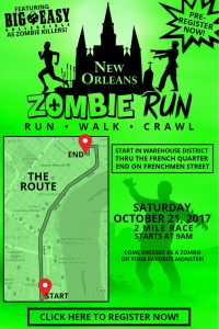 The first ever New Orleans Zombie Run is a two-mile race that starts at Generations Hall in the Warehouse District, goes through the French Quarter, and ends on Frenchmen Street. Runners (or walkers!) are encouraged to dress as a zombie or monster of choice. The Big Easy Rollergirls are also making an appearance as zombie killers. Registration begins at 8a.m. and the race starts 30 minutes later. Those who want to register now can for $20 early bird registration or $50 VIP registration, which includes an open bar at the end of the race from 10a.m.-1p.m., food while it lasts and private restrooms. All participants receive a 2017 Zombie Run t-shirt.