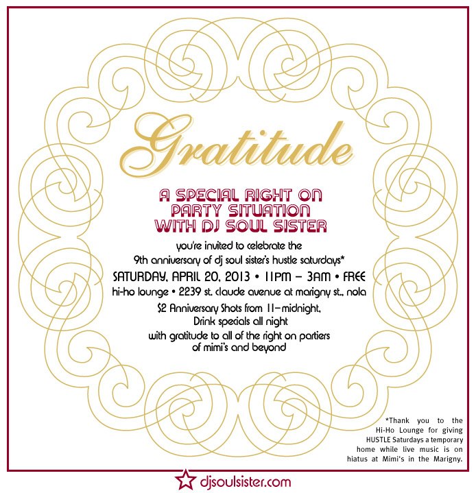 Soul Sister says she named her 9th Anniversary party “GRATITUDE” in thanks of all those that have supported her Saturday night dance party over the years.