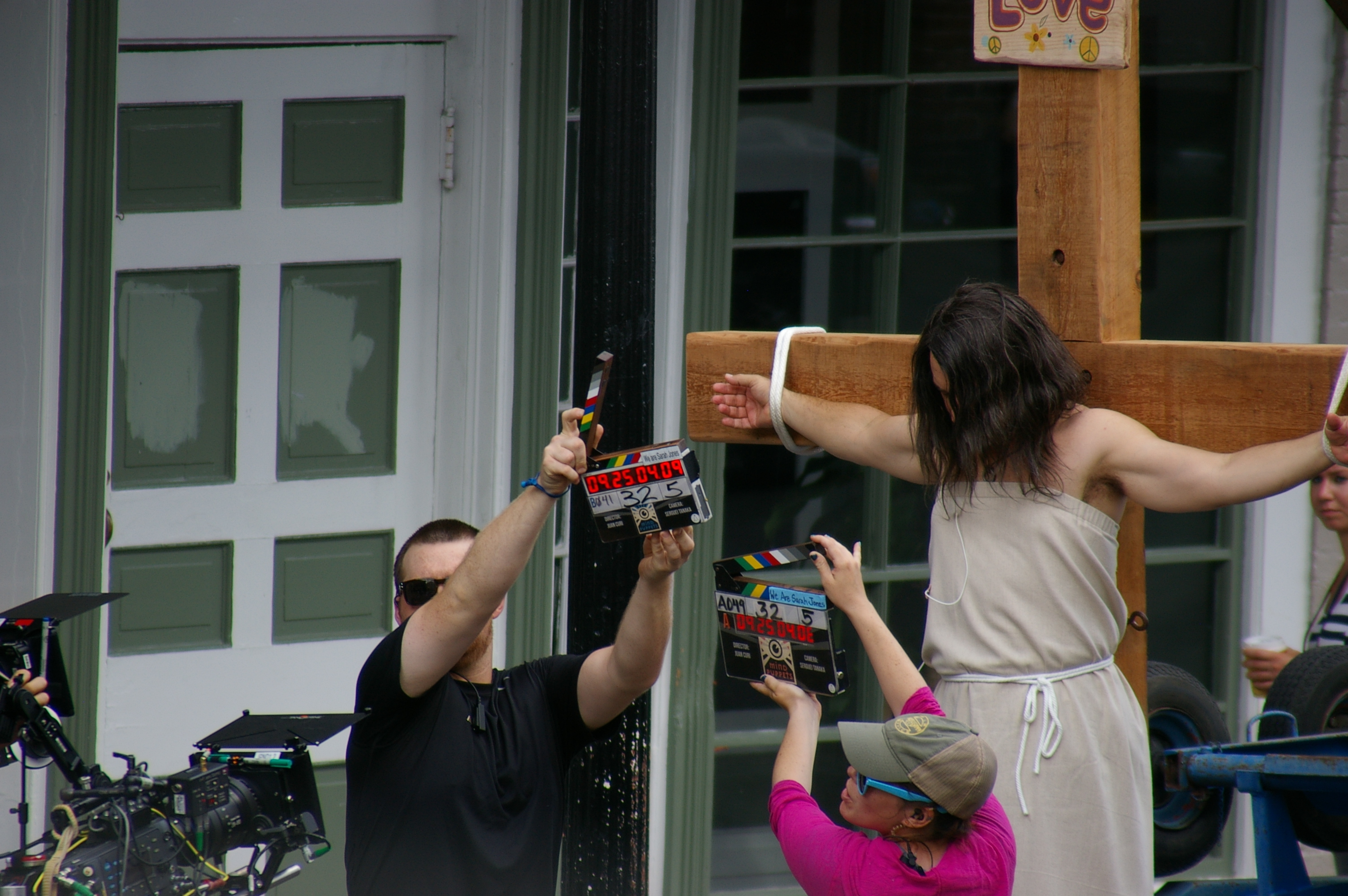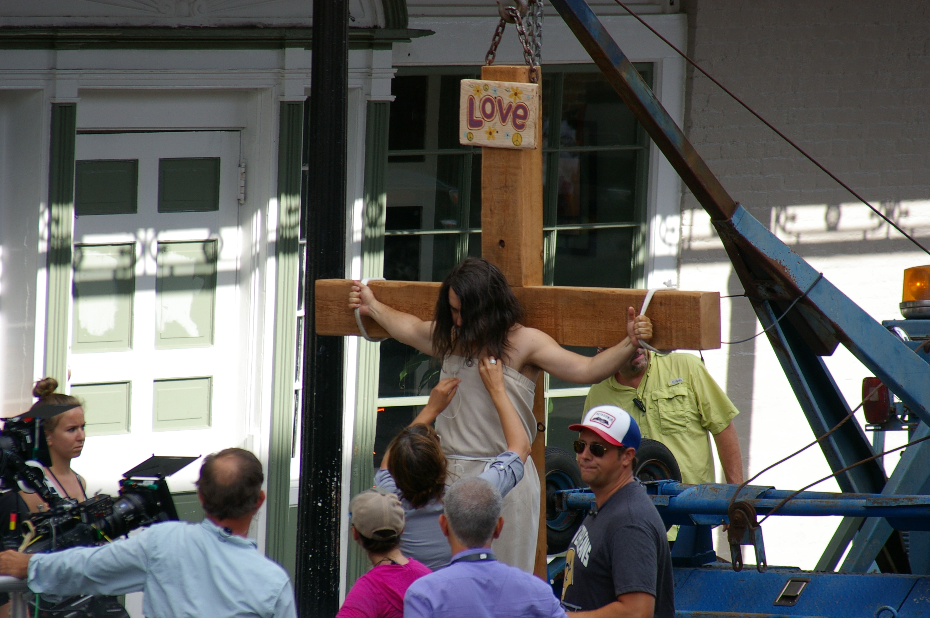 Pollak, wearing a toga-like sheet over cargo shorts and red tennis shoes, seemed somewhat comfortable as he grasped clean white ropes on each arm of the wooden cross while getting a touch up on his makeup and chatting with the director, Juan Curi.