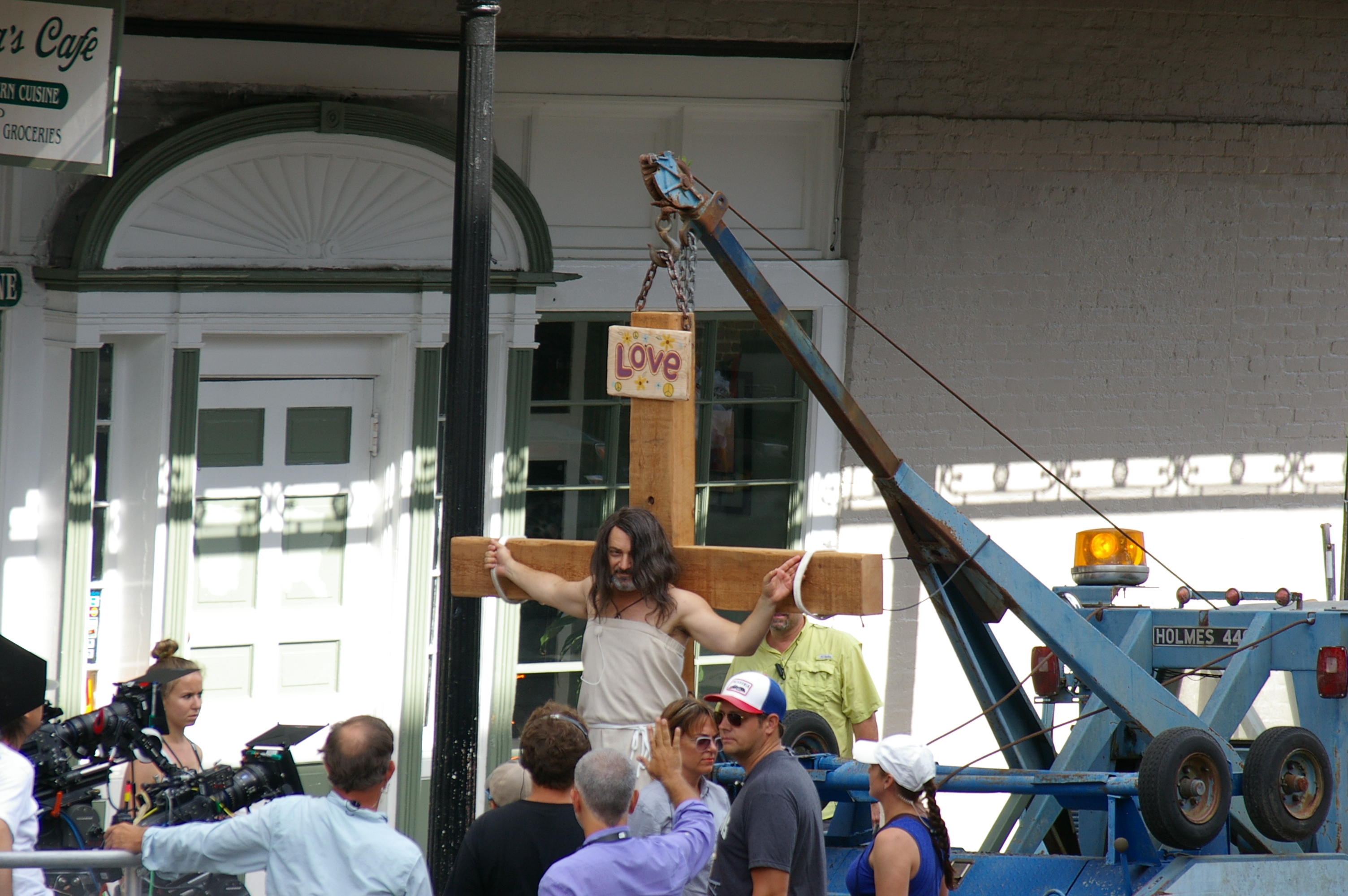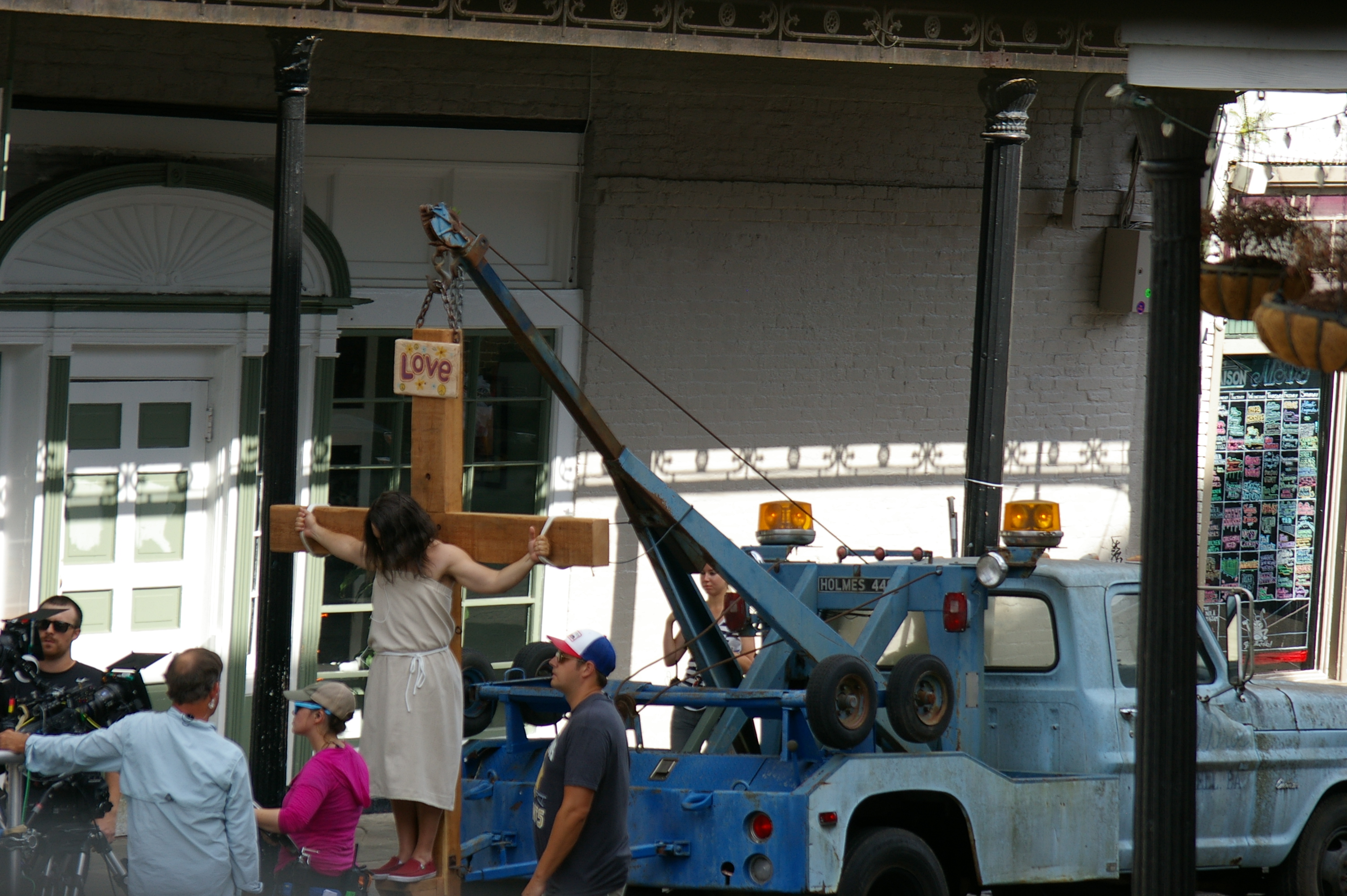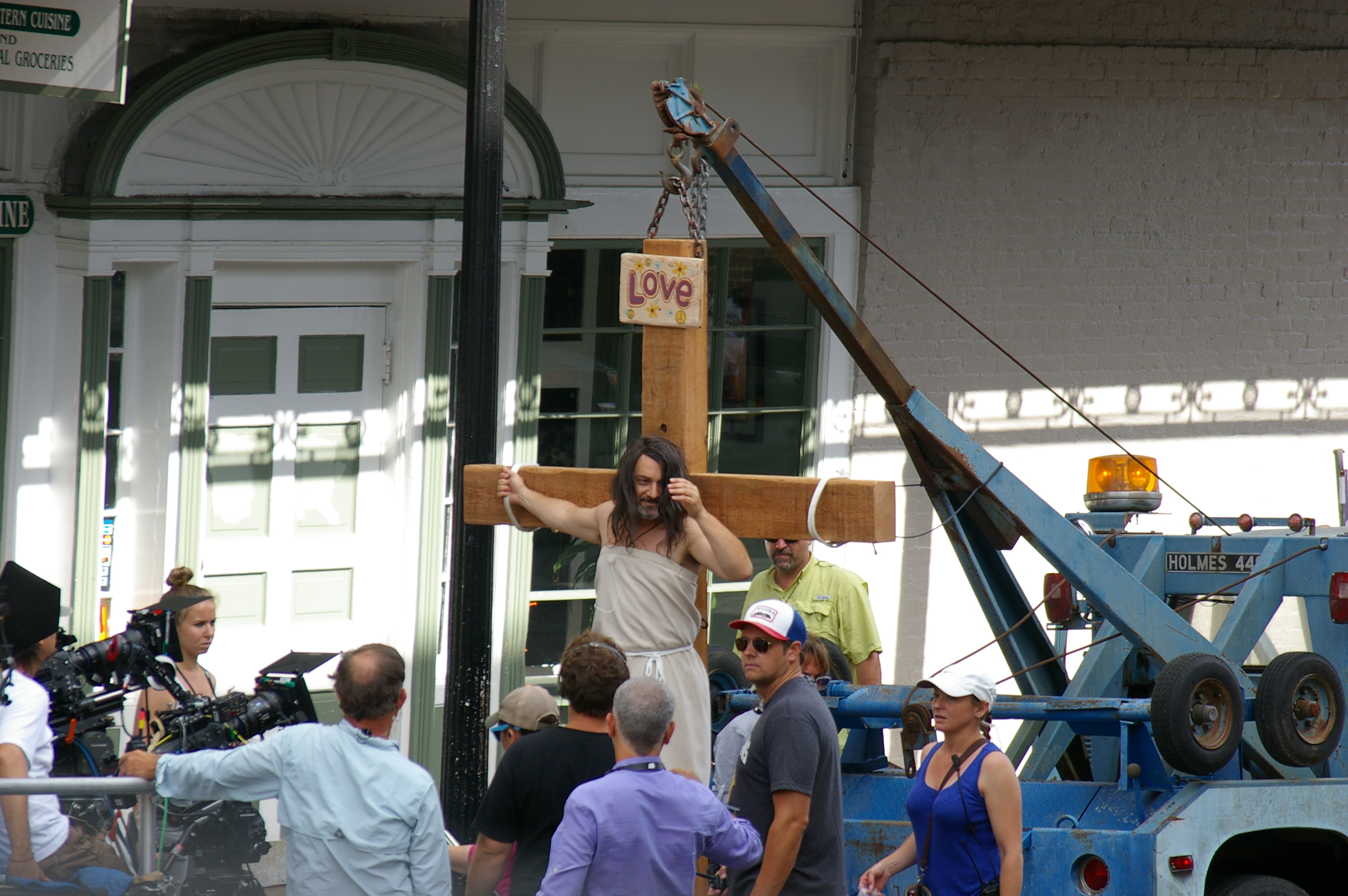 Is this the rapture? Nope, it’s just another movie filming in New Orleans. A movie called Mind Puppets, which stars Pollak as a hypnotist who suffers a stroke in the middle of a show. And then dresses up as Jesus and gets towed around Frenchmen Street, apparently.