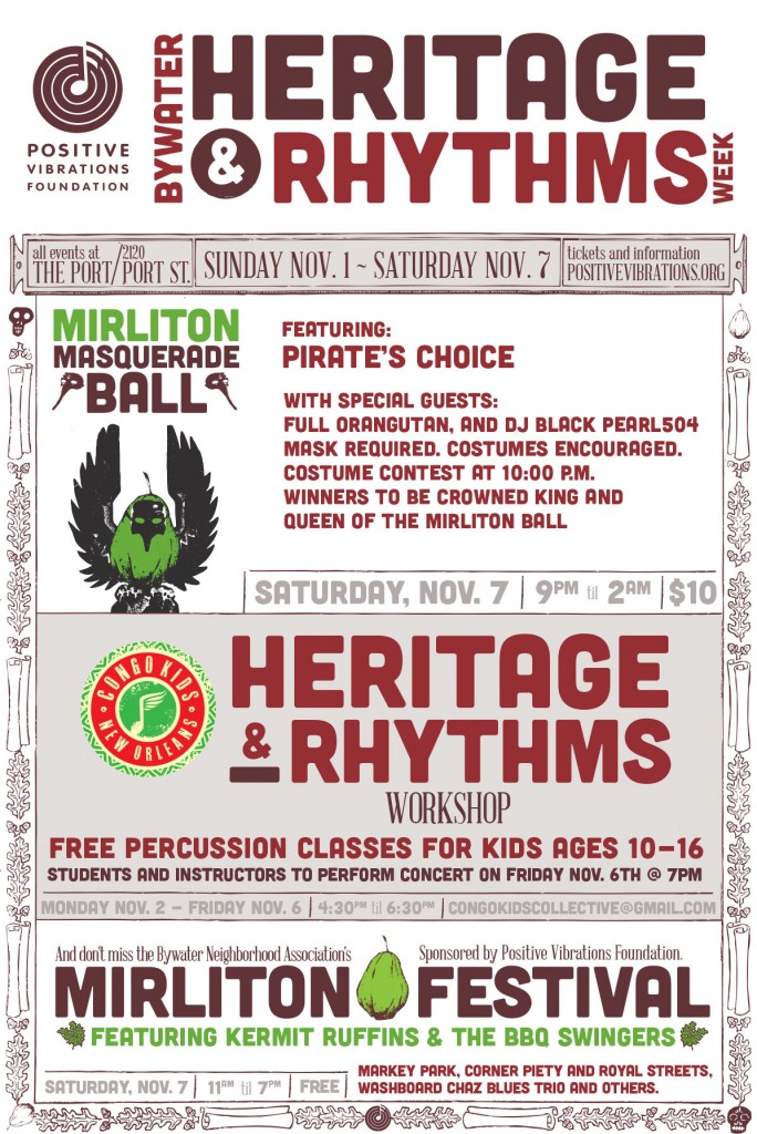 The Mirliton Festival is part of the Positive Vibrations Foundation’s Bywater Heritage & Rhythms Week. The series also includes free percussion classes at Port for kids ages 10-16. This Congo Kids Heritage & Rhythms Workshop began on Monday, November 2 and will continue until Friday, November 6. Percussion instructors include Luke Quaranta (of Toubab Krewe, Benyoro, humanBEING, Pirate’s Choice), Raja Kassis (of Antibalas, Raja Kassis’ humanBEING, Pirate’s Choice), Sam Dickey (of Benyoro, Toumani Diabate, Pirate’s Choice), Morgan Price (of Duke Ellington Orchestra, FELA! on Broadway), Eric Vogel (of Big Sam’s Funky Nation) and more.