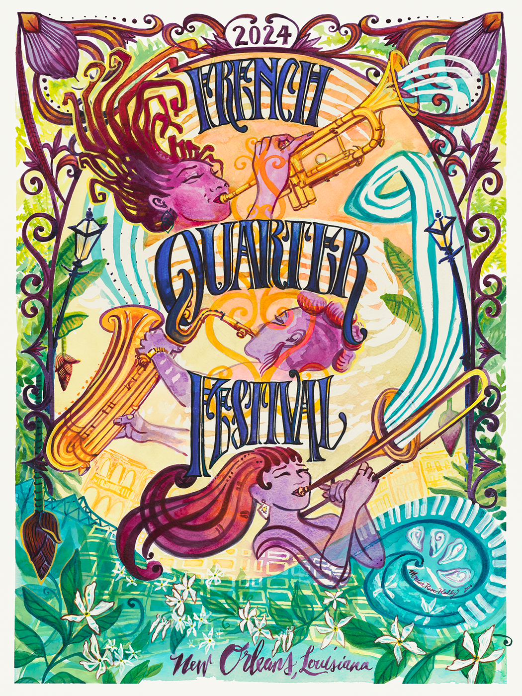 As the excitement builds for the upcoming 2024 French Quarter Festival, all eyes are on the festival’s official poster, a stunning creation by local artist Monica Rose Kelly. With over 13 years of artistic contributions to the New Orleans music community, including several Offbeat Magazine covers, Kelly’s work has become synonymous with the vibrant spirit of the city’s cultural scene. Her latest work, the official poster for the French Quarter Festival, pays homage to the musical mothers of New Orleans, celebrating their invaluable contributions to the city’s rich heritage.