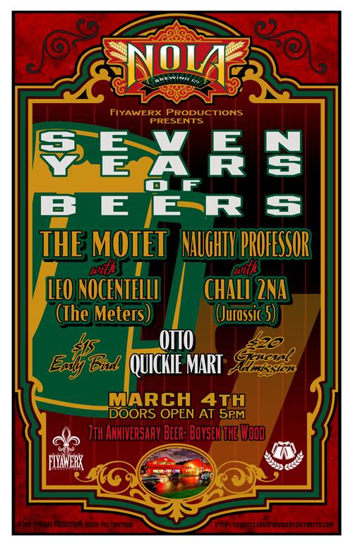 The event–dubbed Seven Years of Beer–will feature a pair of special collaborative performances. Colorado jam-funk group The Motet will team up with Meters guitarist Leo Nocentelli, while local jazz-funk six-piece Naughty Professor will join forces with Jurrassic 5’s Chali 2na. Additionally, the night will include DJ sets from Otto and Quickie Mart, as well as showcase of NOLA Brewing Co’s seventh anniversary beer “Boysen the Wood.”