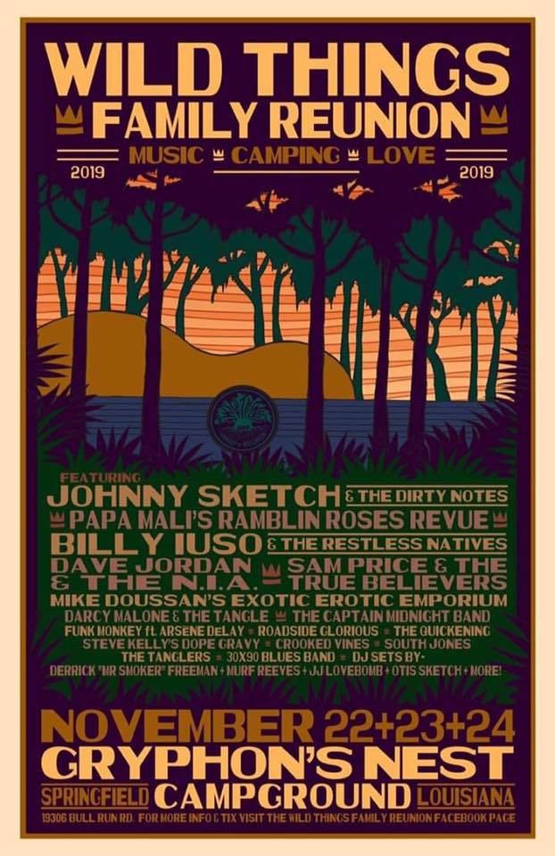 Papa Mali’s Ramblin’ Roses Revue, Johnny Sketch and the Dirty Notes, Sam Price and the True Believers, Funk Monkey, The Quickening, Darcy Malone and the Tangle, Dave Jordan and the N.I.A, Crooked Vines, The Tanglers, South Jones, Mike Doussan, Billy Iujso and Restless Natives, 30×90 Blues Band, Captain Midnight Band, DJ sets from Derrick “Mr Smoker” Freeman, Murf Reeves, Otis Sketch and more will provide the tunes at Wild Things Family Reunion.