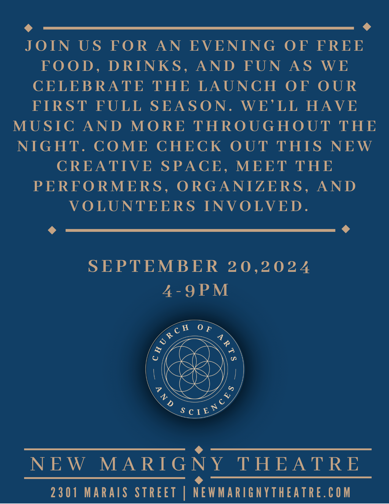 New Orleans welcomes a new cultural hub with the season opening event of the New Marigny Theatre on Friday. September 20, 2024. Located at 2301 Marais Street, this new performing arts and education center aims to bring a fresh wave of creativity to the city and new life to this restored church. The theatre’s inaugural season will feature an exciting array of performances, workshops, and educational programs that reflect New Orleans’ rich artistic heritage and contemporary cultural pulse.