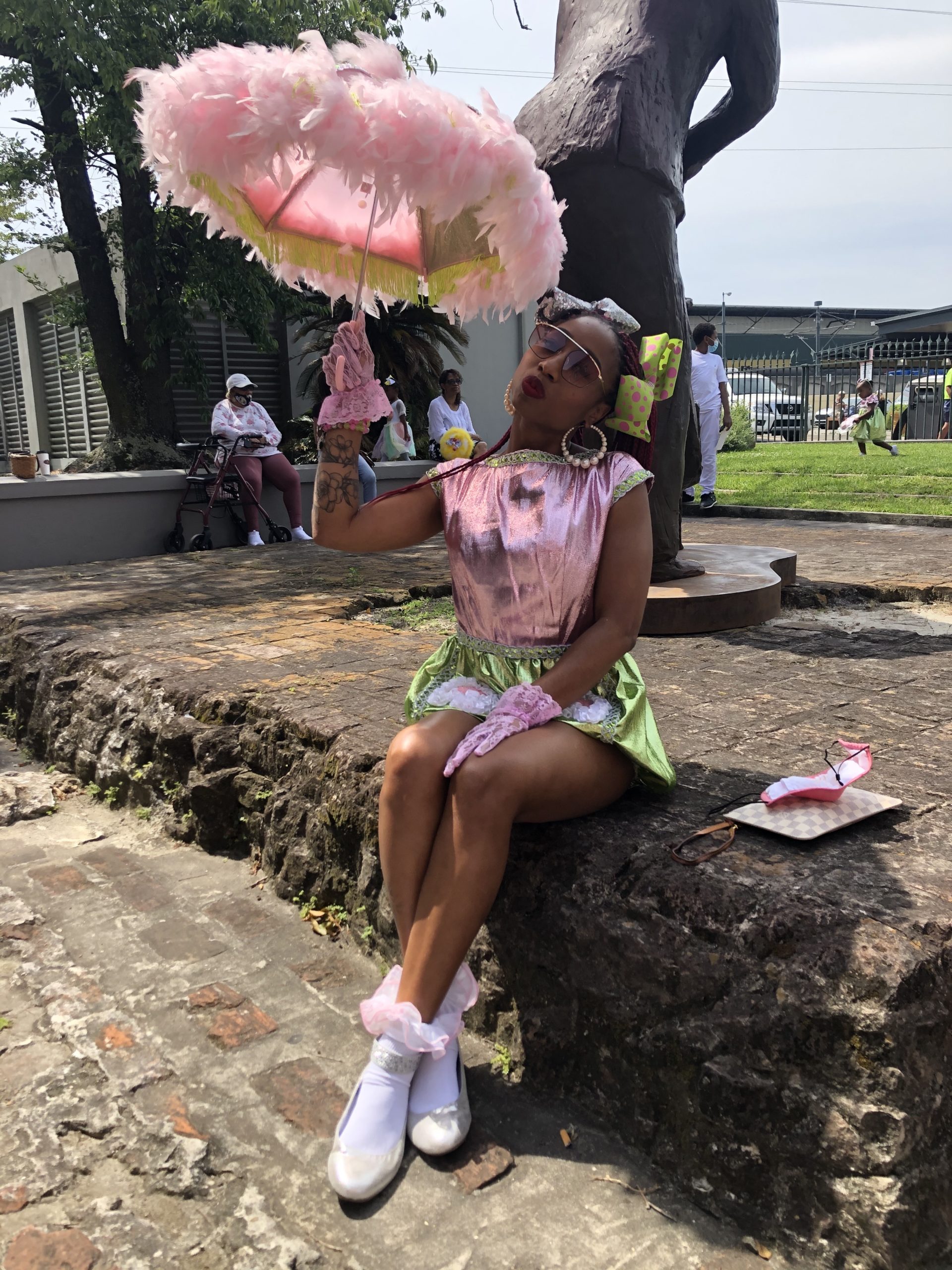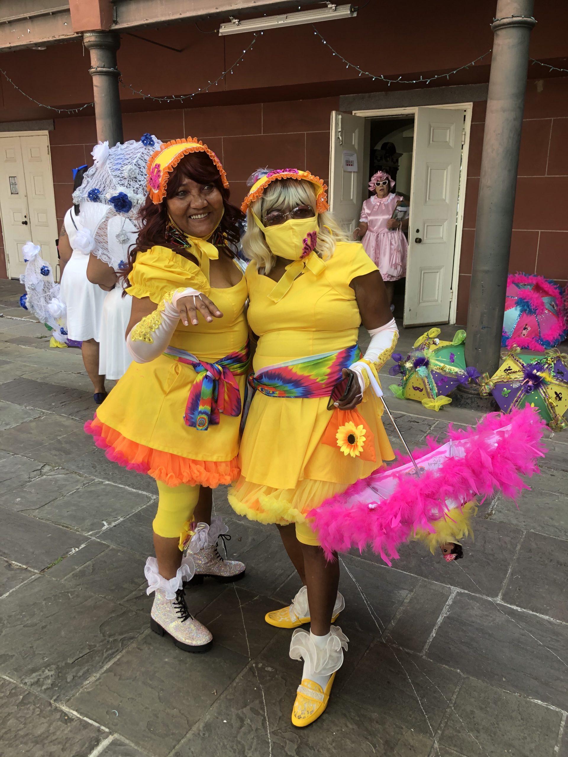 In her definitive book on the cultural practice, Walking Raddy: The Baby Dolls of New Orleans, Kim Vaz-Deville chronicles Baby Dolls from their origins in Black Storyville, dating back to 1912. In a 2105 article for OffBeat, she wrote, “Just how the Baby Doll masking tradition came into existence is buried in many different stories of origin. Beatrice Hill worked as a prostitute in ‘black’ Storyville, the few blocks around Gravier and Perdido Streets. There gambling, drinking and sex for pay were readily available to both black and working-class white men. Hill said the Baby Doll tradition began as a result of a competition between her uptown (above Canal Street) gang and a downtown group of women working in Storyville itself. Another woman who masked told WPA field investigator Robert McKinney that she always dressed as a Baby Doll and other women began to imitate her. Regardless of the veracity of either claim, by the 1930s the Baby Dolls had become an iconic part of Black Mardi Gras traditions alongside the Indian gangs, the Zulu Social Aid and Pleasure Club parade and the Skeleton gangs.