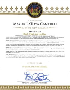 NOW, THEREFORE, I, LaToya Cantrell, Mayor of New Orleans, do hereby proclaim June 11, 2024, as ‘Back That Azz Up Day’ in the City of New Orleans, in recognition of the 25th anniversary of the music video, and urge all citizens to join in the celebration of this monumental achievement and the artists who have made a lasting impact on our city’s musical legacy.”