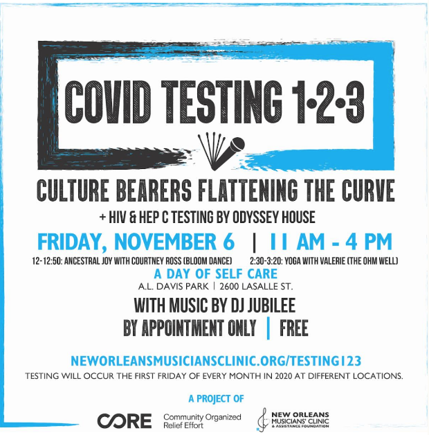 “If you have interacted with people outside of your household recently (think Halloween activities), testing can stop the asymptomatic spread of COVID-19,” say event organizers. HIV and Hep-C testing will also be available from Odyssey House as well as 100 free shots from the New Orleans Health Department.
