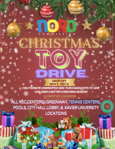 From Monday, Nov. 1, through Friday, Dec. 6, community members are invited to donate new, unwrapped toys that will brighten the holidays for families in need. Donation boxes will be conveniently located at all NORD Recreation Centers, the Lafitte Greenway, NORD Tennis Centers, NORD pools, the City Hall lobby, and the University Center lobby on Xavier University’s campus.