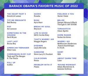 Obama Tweeted, “I always enjoy sharing my end of year music playlist with all of you — and this year we heard a lot of great songs. Here are some of my favorites. Are there any songs or artists I should check out?”