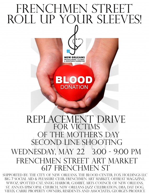 If at least 25 people sign up to donate, the blood drive will be held Wednesday, May 22 from 3:00 p.m. until 9:00 p.m. on Frenchmen Street in front of the Spotted Cat. Those interested in donating may contact Erica Dudas with the NOMAF at 504-415-3514 or [email protected] for more information about donating blood for the Mother’s Day victims. Questions? [email protected].