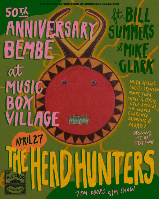 The Headhunters celebrate their 50th Anniversary Bembé at the Music Box Village on Saturday, April 27, starting at 8 p.m. Co-led by percussionist Bill Summers and drummer Mike Clark, The Headhunters are best known for their work on Herbie Hancock‘s classic recordings “Head Hunters” and “Thrust,” the band has continually reinvented itself over the past decades, keeping things fresh thanks to the deep musicality of its members. Joined by special guests Stanton Moore, Yusa, Wil Blades and Clarence Johnson, this epic event promises a fusion of jazz, funk and rock that has inspired musicians across genres for decades. Learn more or purchase tickets here.