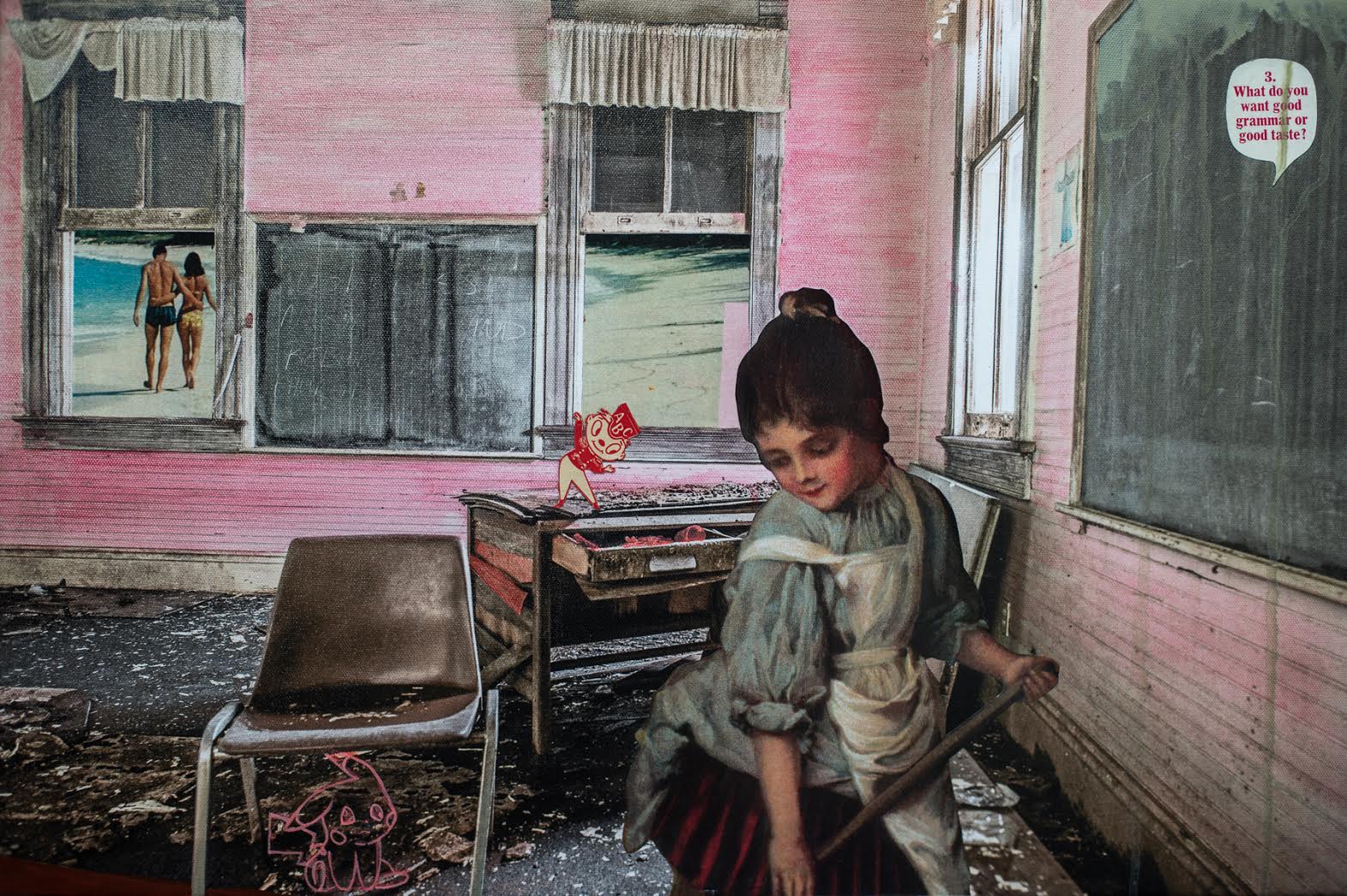 The 13 original pieces were created by combining a variety of media—collages, paintings and more—with photographs printed on canvas. The resulting works deal with innocence lost by taking revered memories of the past and putting them in places they were not meant to occupy.