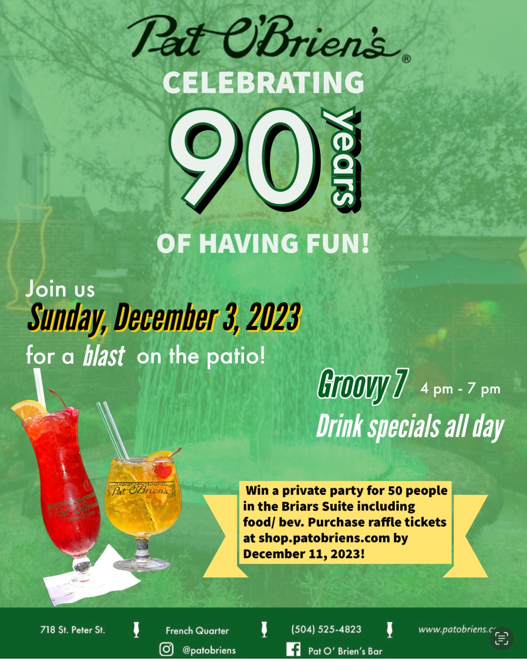 The celebration on December 3, 2023 will feature Hurricane and Cyclone drink specials, live music from The Groovy 7 Band on the patio from 4- 7pm, and Santa will be there to spread holiday cheer. A special 90th anniversary Hurricane glass will be available in the gift shop and online and there will be a raffle to win a 3 hour private party for 50 people in Pat O’s Briars Suite overlooking Bourbon Street with all food and drinks included. Pat O’Briens has always supported the New Orleans community, and this year all proceeds from the raffle will be donated to New Orleans Childrens Hospital. Tickets can be purchased for $10 on their website.