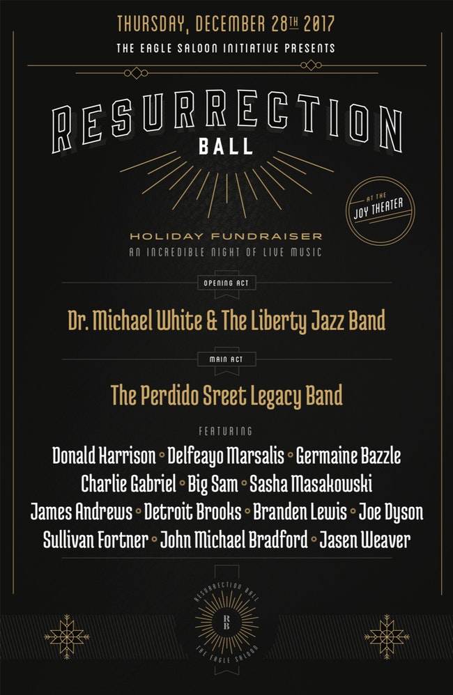 Donald Harrison, Delfeayo Marsalis, Germaine Bazzle, Charlie Gabriel, Big Sam, Sasha Masakowski, James Andrews, Detroit Brooks, Branden Lewis, Joe Dyson, Sullivan Fortner, John Michael Bradford, Jasen Weaver, Dr. Michael White & The Liberty Jazz Band are all confirmed musical performers for December 28’s Resurrection Ball Holiday Fundraiser at the Joy Theater. The event will be headlined by The Perdido Street Legacy Band.