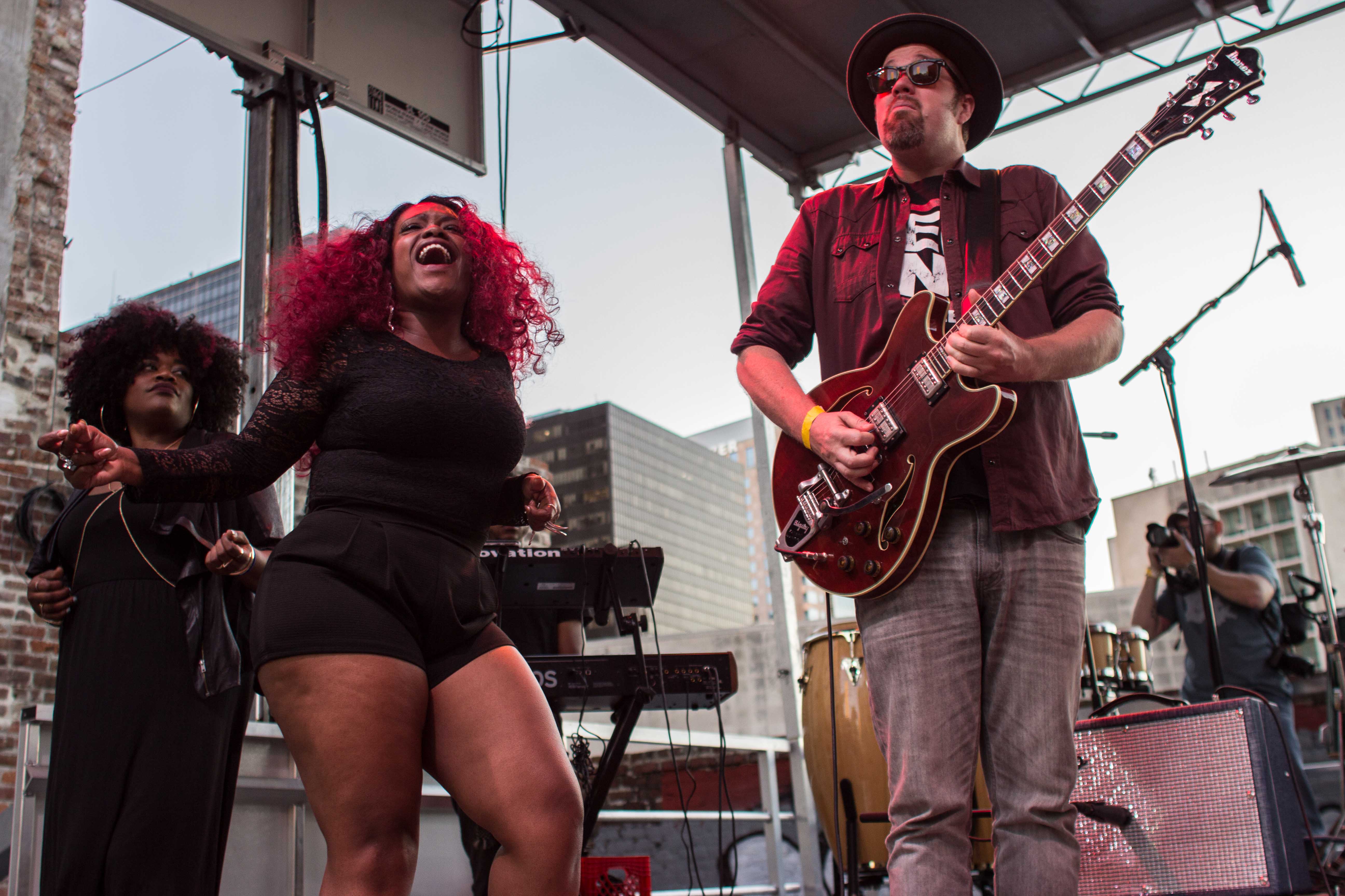 George Porter Jr., Eric Krasno and Big Sam Williams collaborated with Tank & the Bangas for an exciting performance in a lot next to the historic Eagle Saloon in downtown New Orleans yesterday.