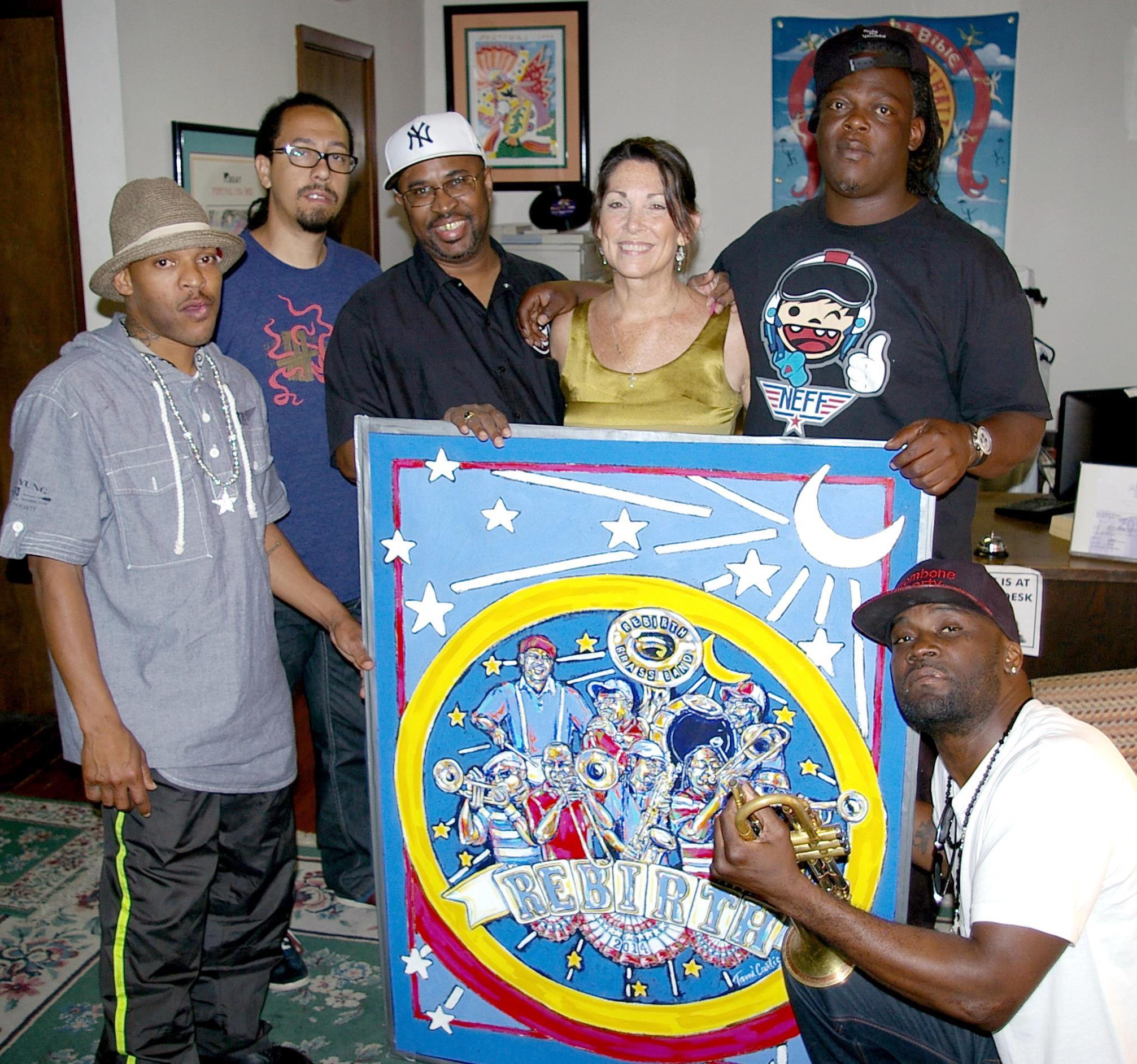 Artist Tami Curtis-Ellis met with members of the Rebirth Brass Band in the OffBeat offices today before Rebirth took the stage at the Louisiana Music Factory to get the band to sign the original painting used as the cover of the 2014 Jazz Fest Bible.