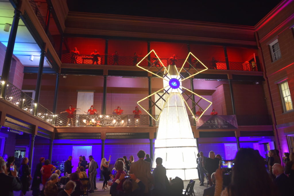 - A large illuminated windmill evoking the Moulin Rouge in Paris greeted patrons at the 2021 Improvisations Gala in the Decatur Street Courtyard of the New Orleans Jazz Museum, photo by Kim Welsh.