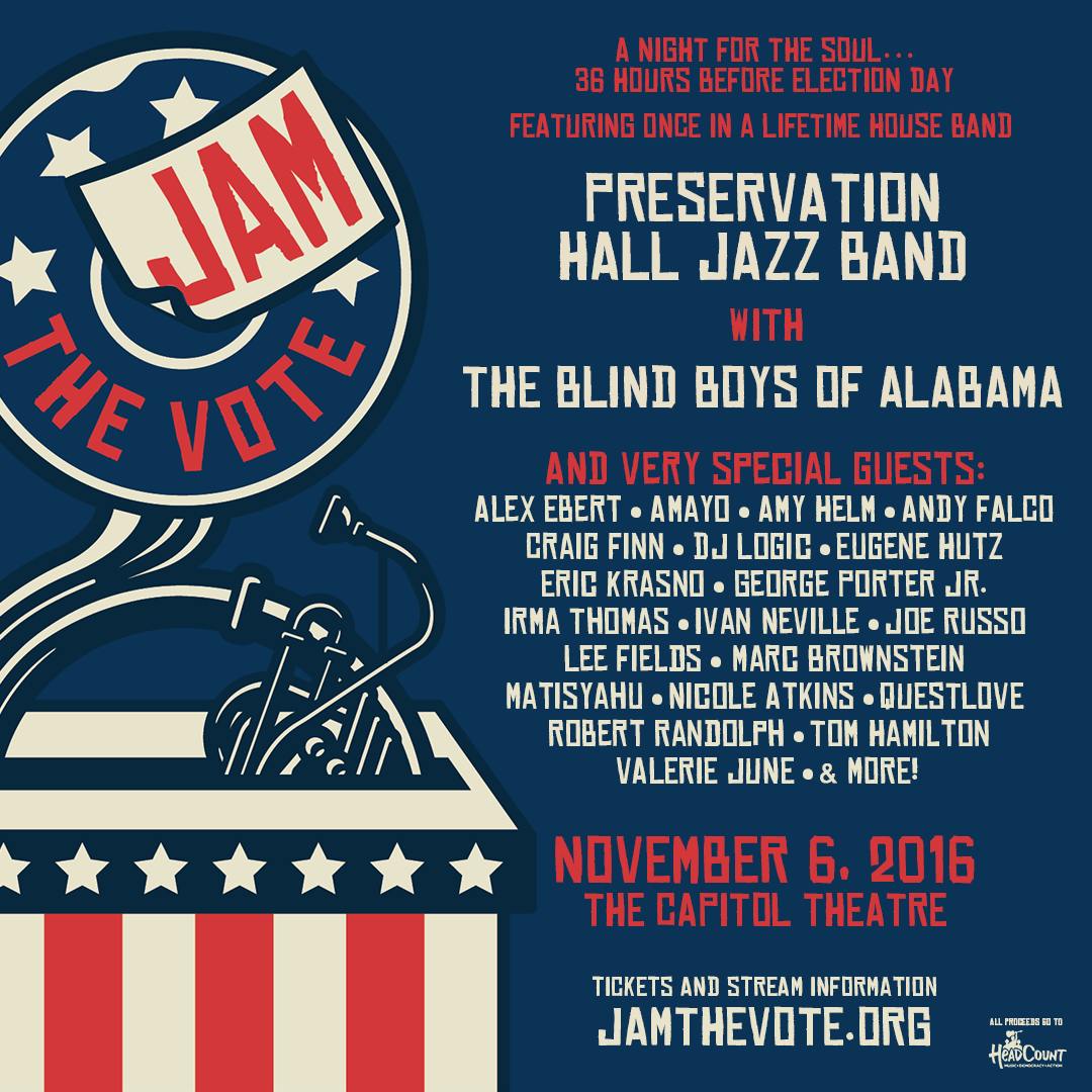 The Preservation Hall Jazz Band will team up with the Blind Boys of Alabama for Jam The Vote, a pre-election concert slated for the Capitol Theatre in Port Chester, NY on Sunday, November 6.