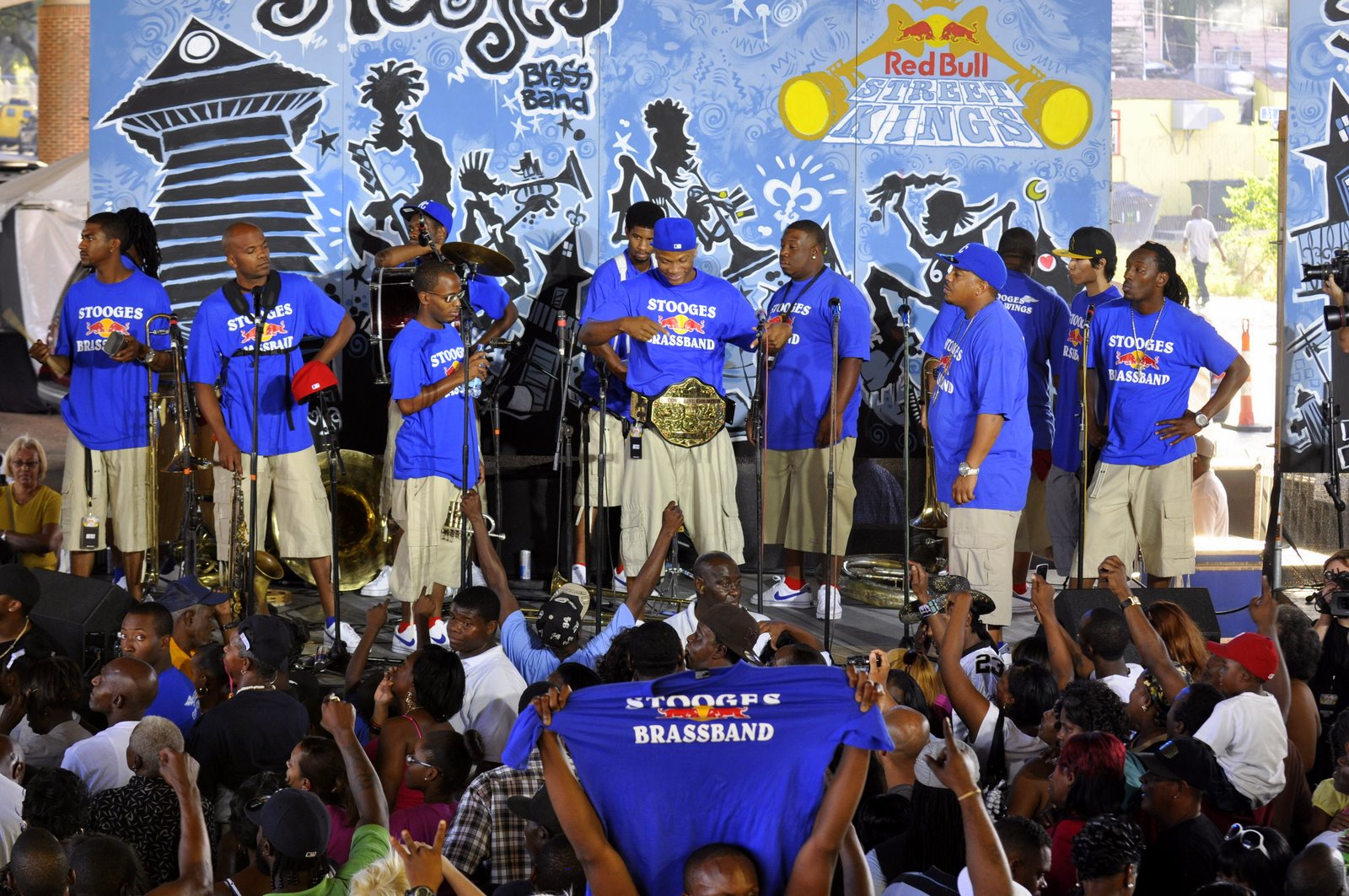 Though the Claiborne bridge is often crowded between between Iberville and Esplanade on any given Sunday for the second line of the week, those that were there on the Saturday of October 23, 2010 will recall the massive scene that shut down traffic for the afternoon as the four “Street Kings” 2010 brass band finalists (vetted via initial rounds of local music authority nominations, band applications and auditions) marched their way through the masses to their pop-up stages under the bridge. Hosted by the “Prince of Treme,” Glen David Andrews and judged by Crescent City music heavyweights like Mannie Fresh and Q93 FM’s DJ Slab1, “Red Bull Street Kings v.I” saw the Soul Rebels, Free Agents, To Be Continued (TBC) and Stooges brass bands give us quite possibly the biggest show we’ve seen from each band.