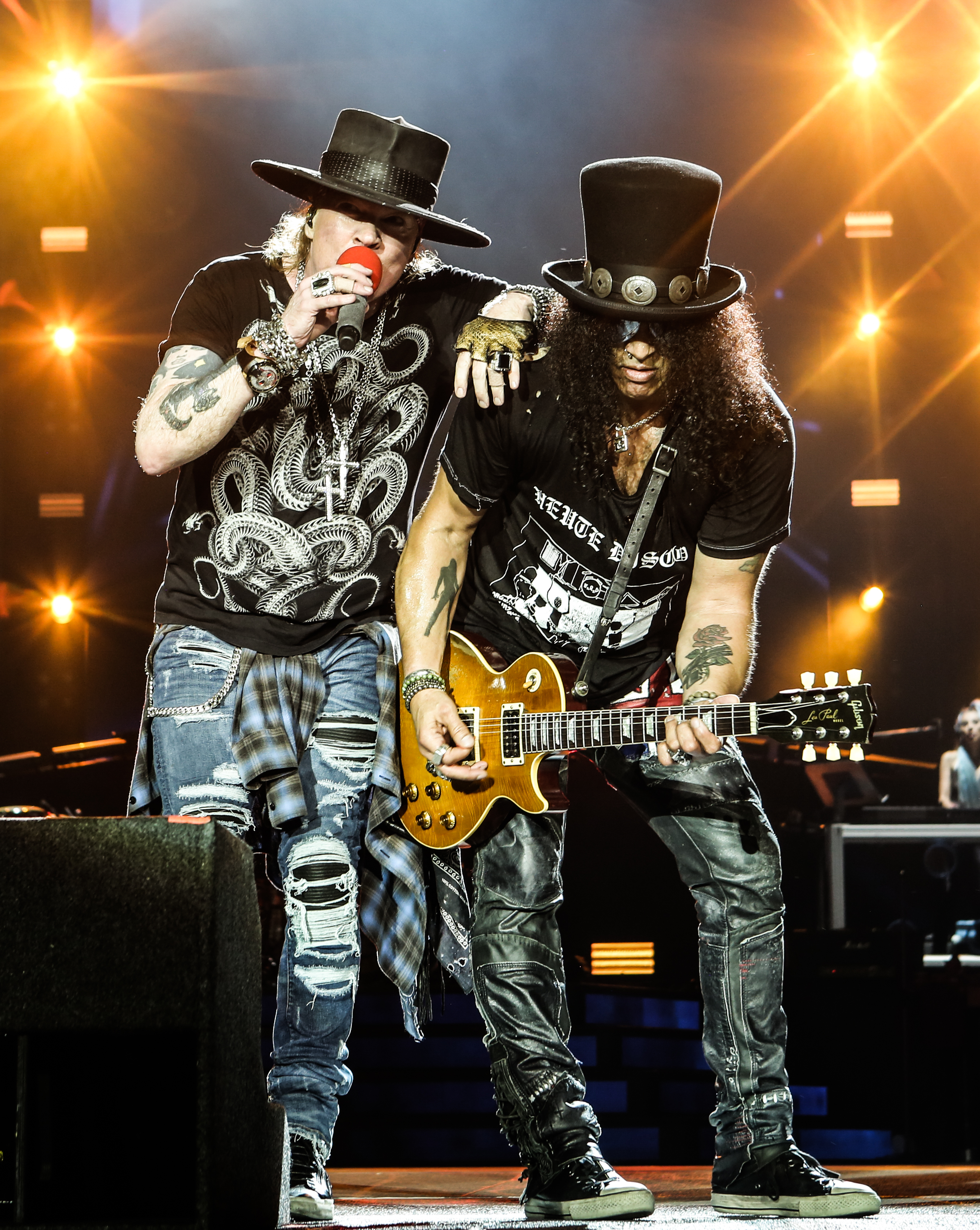 Dudes from my hometown in Georgia would drag race from the high-school parking lot—Camaro tires squealing—to the mall to buy the new Guns N’ Roses album. Such is the primal power this band holds. So anticipating an opening song—“It’s gotta be ‘Paradise City,’ just gotta be”—in banter with the crowd around you turns a bit sour when you learn the setlist has been the same for every show this tour, and that “Paradise City would, in fact, close the night. Bummer. The good-natured, well-muscled bro next to me, taking a break from sucking face with his much-stilettoed date, added that they’ll play 24 songs and that “Welcome to the Jungle” would be fourth.