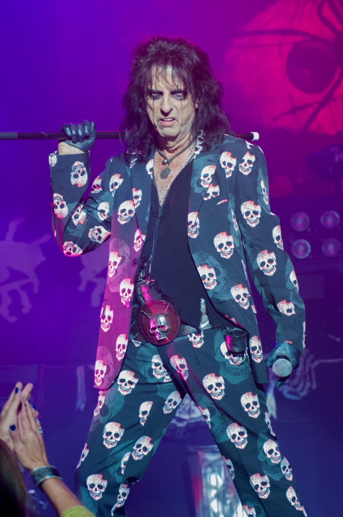 Glam rock without theatrics is just rock. When I hear power chords shredded by a band with three guitars—and a double-guitar, and a bass, all keeping time to an eight-cymbal drum set–I want the show to match the music. I want ageless, fluffy hair. I want bedazzled vests. I want fog and fire. Though not strictly necessary, bubbles are appreciated, as are samurai swords, back-up dancers, puppets and props that look peeled from a sheet of flash tattoos: A silver dagger, a snake, a gas mask, a guillotine, a hundred-dollar bill. Pulling from a pink toy box painted with harlequins, Alice Cooper delivered all of these, and more.