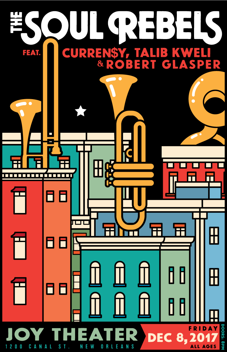 As previously reported by OffBeat, the December 8 show will pair frequent collaborators Soul Rebels and Talib Kweli, who spent this past summer touring Europe together. Kweli is a veteran MC whose work both as a member of the 1990s hip-hop duo Black Star (alongside Mos Def) and his decade-plus of work as a solo artist have made him one of the most celebrated rappers of his generation. Curren$y is, of course, one of New Orleans’ pre-eminent rappers, whose weekly Jet Lounge events at the House of Blues have contributed greatly to fostering a hip-hop community in the city. As the founder of Jet Life Recordings, he’s played an integral role in elevating the voices of emergent rap talents, as well.