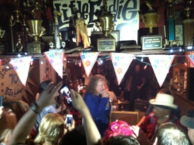 Then the singer took center stage until around 1:30 a.m. playing blues standards and playfully quipping that it was the “worst PA ever.” Again, all in fun. It was a spirited set with 75 lucky music lovers crammed into a space for 50 near the “stage.” (BJ’s has no elevated stage just an “area” where the bands play so unless you were in the first three rows the enjoyment was in the sound, not so much the sights). Julie Kelley says her new claim to fame is the fact that due to respect for the neighbors, the neighborhood bar does not play music past 1:30 a.m. and she was forced to hold up a “wrap it up sign” to Robert Plant.