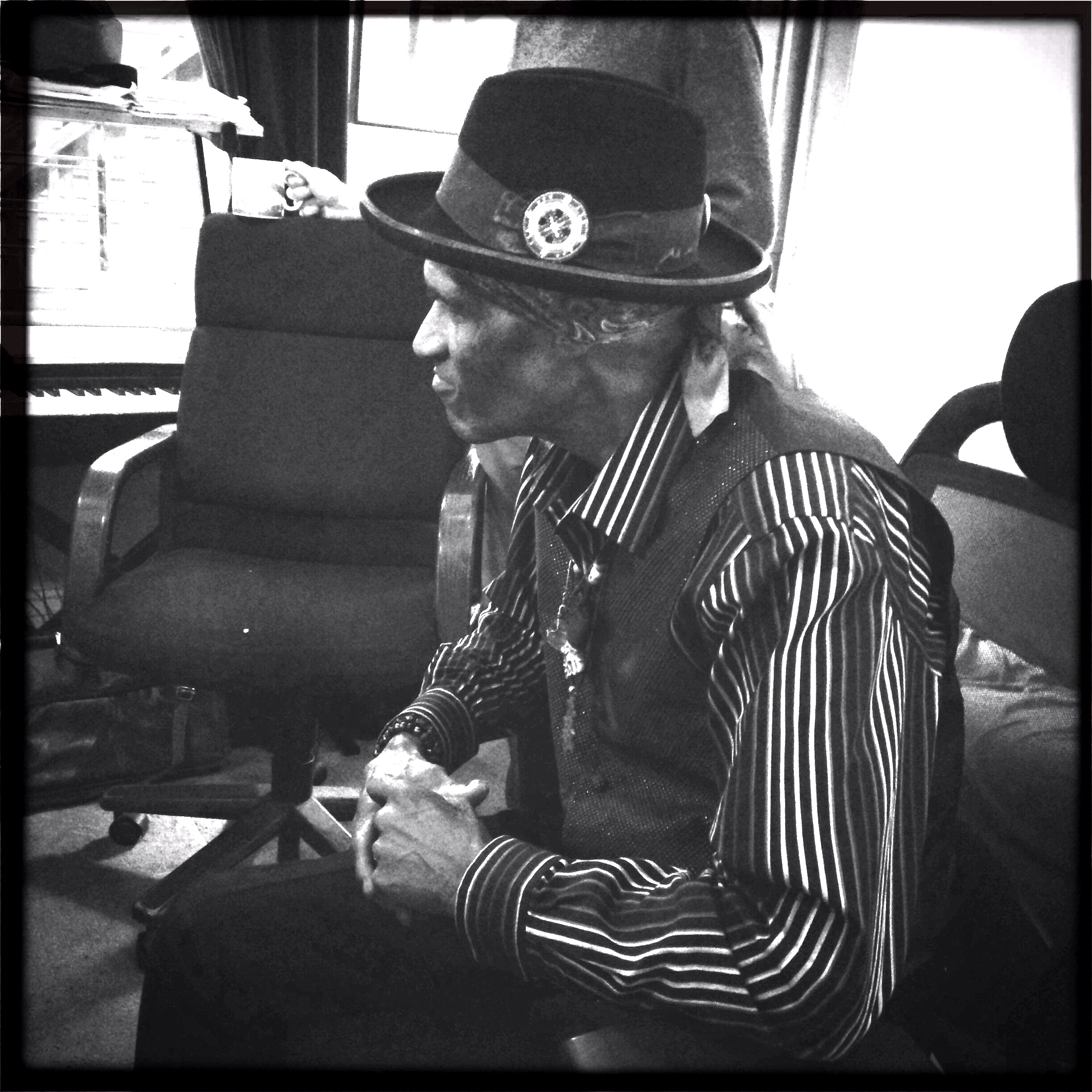 Clad in a black vest and round black hat rimmed with feathers and sporting a yellow “Poppa Funk” button in honor of his older brother Art, Cyril wastes no time.